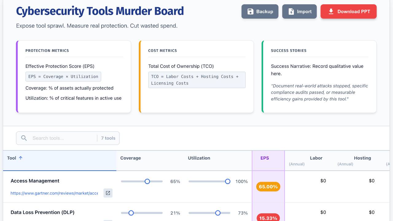 The Cybersecurity Tools Murder Board Template helps teams rigorously evaluate security tools for retirement. Use it to challenge assumptions, uncover blind spots, and ensure only the most effective, cost-efficient, and defensible tools remain in your environment.