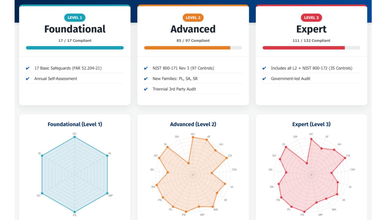 CMMC made simple: the Reference Guide lays out all three levels with a sharp, at-a-glance illustration and clear explanations for every control. Giving you instant clarity without digging through pages of documentation.