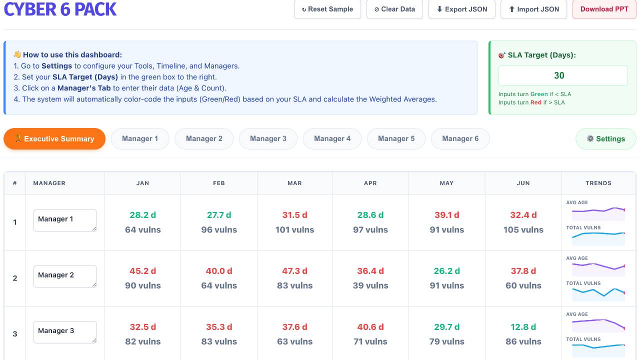 The Cyber 6 Pack is a gamified vulnerability management report that turns security metrics into a competitive scorecard. Track managers across application security tools and build a stronger, more resilient security posture through data-driven progress.