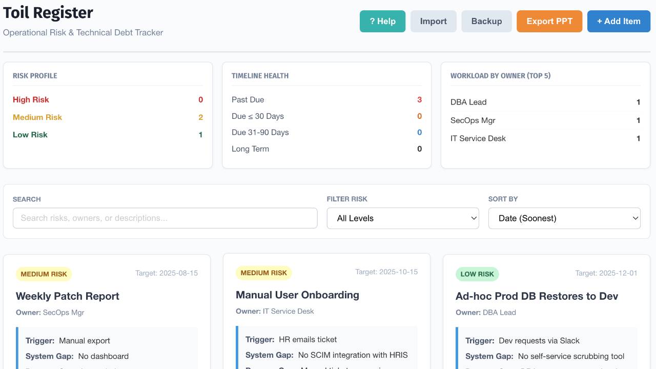 Track and reduce operational risk and technical debt with a Toil Register built for security and IT leaders. Capture manual work, system gaps, owners, risk levels, KPIs, and fixes. Prioritize remediation, improve efficiency, and export executive-ready reports.