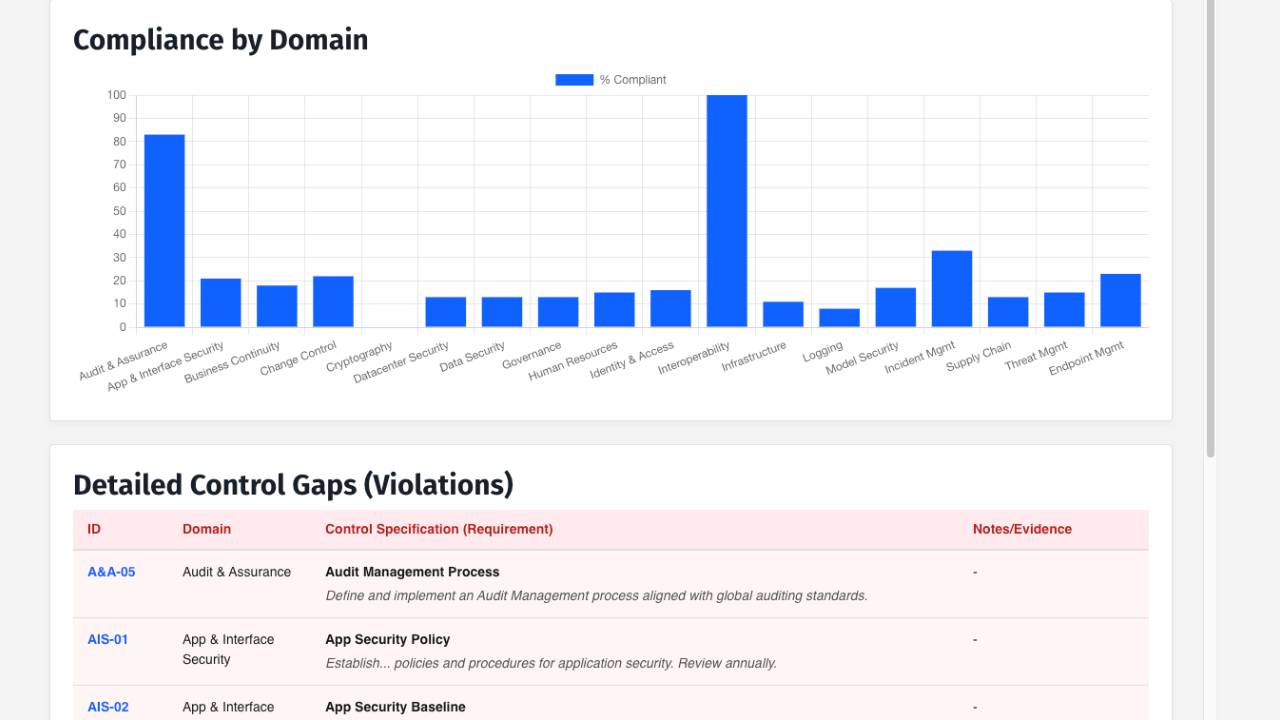 Master AI security with this interactive assessment tool based on the CSA AICM v1.0.3. Features automated risk scoring, real-time compliance dashboards, detailed gap analysis, and one-click PowerPoint reporting to streamline your AI auditing process.