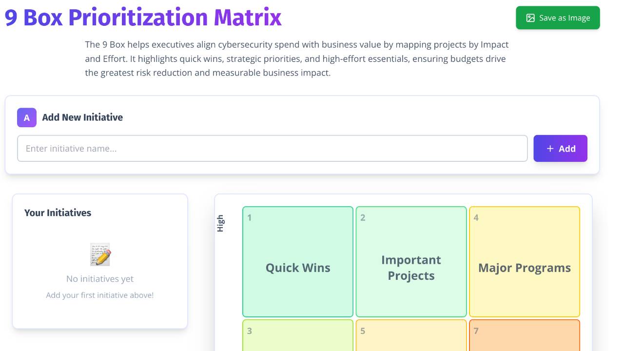 The 9 Box template helps executives align cybersecurity spend with business value by mapping projects by Impact and Effort. It highlights quick wins, strategic priorities, and high-effort essentials, ensuring budgets drive the greatest risk reduction and measurable business impact.